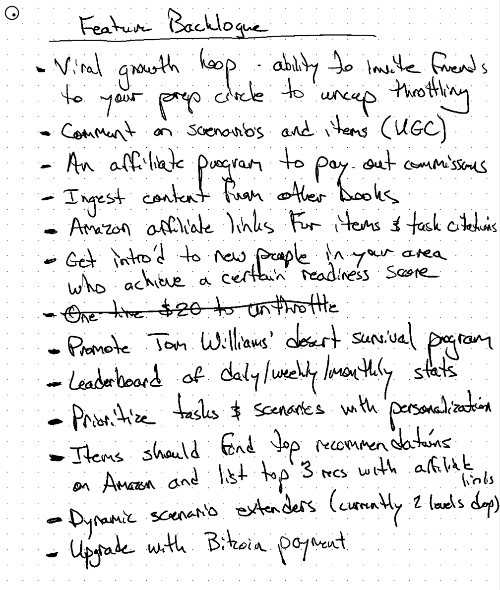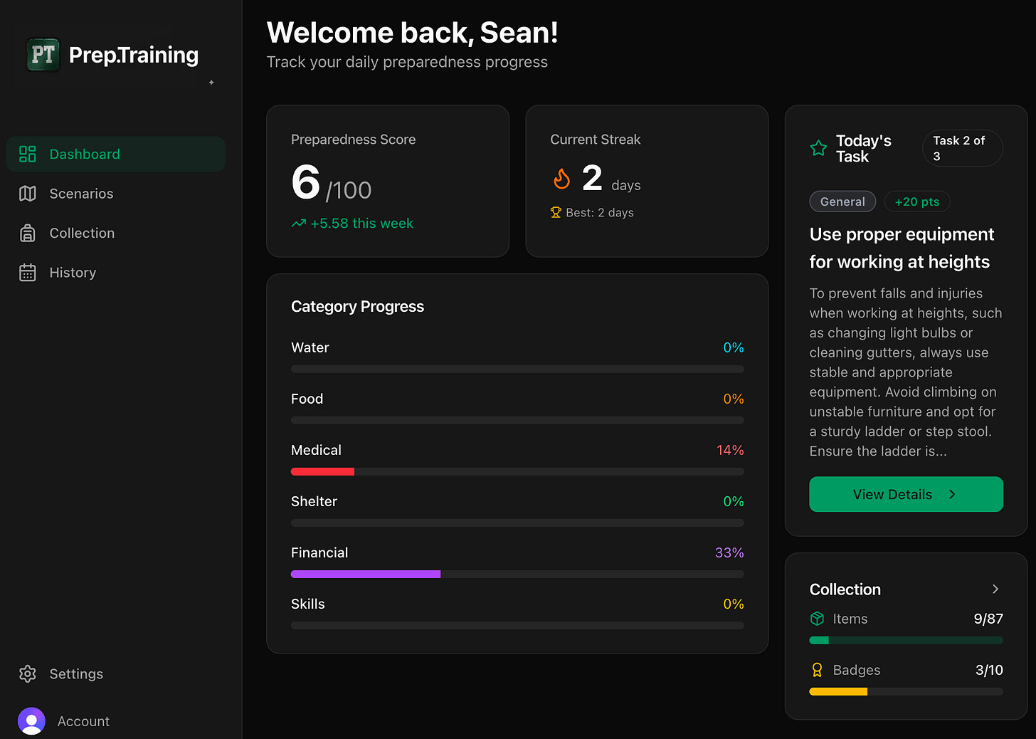 Fast forward to now Sunday afternoon and I have Prep.Training live and wired up to accept payments via Stripe. This is an idea a buddy and I had talked about wherein we gamify the art of improving ones disaster preparedness in a way that appeals to ordinary, rational people and not just the diehard doomsday preppers. We need to make it simple for the average person to carve out 15min per day towards taking small incremental steps that greatly improve their resilience in the face of life’s curveballs. Prep.Training uses standard gamification patterns like streaks, badges, points and unlocks to introduce preparedness concepts and give people a tool for improving their readiness.
